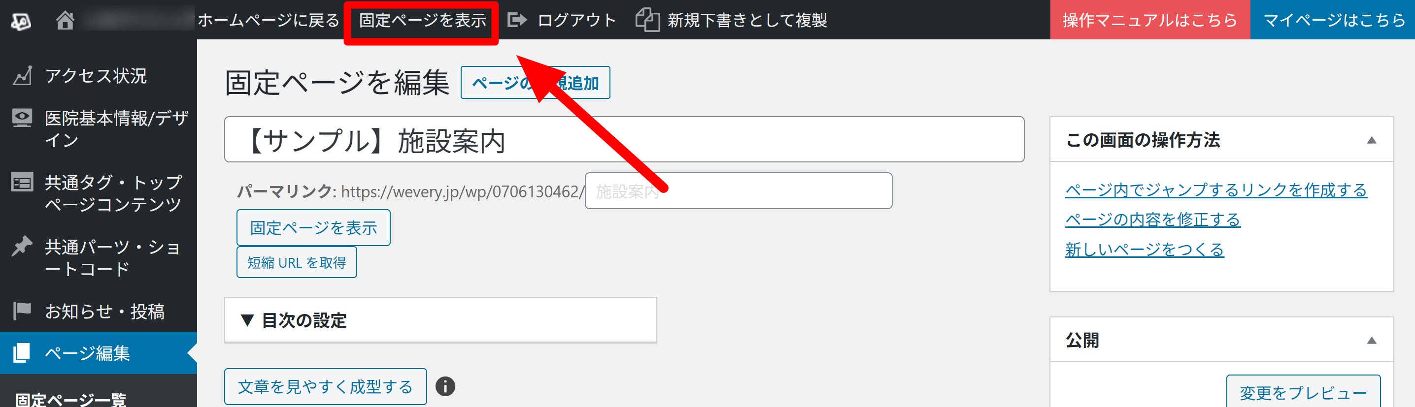 作成したページのURLを確認する Home » 基本操作 » 作成したページのURLを確認する 短縮URLを取得 編集ページのタイトル下「短縮URLを取得」をクリックすると表示されます。 ※ページの公開をしていないと表示されません。 アドレスバーから取得 または、上部の黒い部分の「固定ページを表示」をクリックして、ページを表示するとアドレスバーに表示されます。 アドレスバーを一度クリックすると、URL全体が選択されます。 そのままコピーすれば、URLをすべて控えることができます。