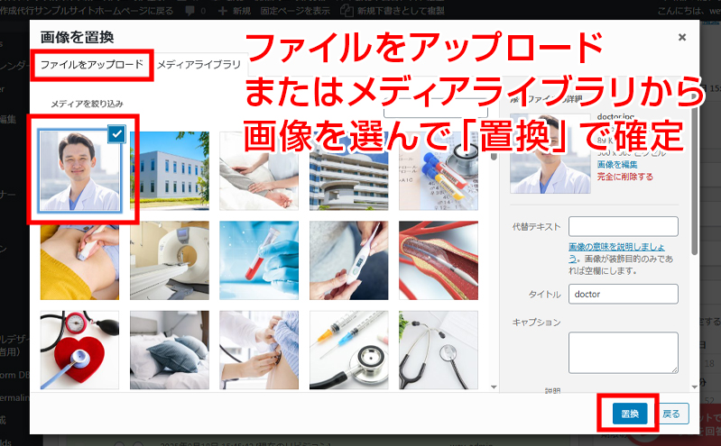 2.ファイルをアップロード、またはメディアライブラリから画像を選んで「置換」で確定
