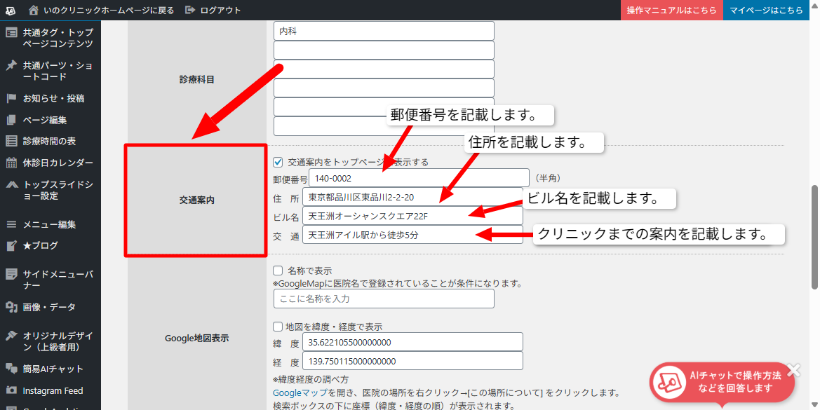 住所の記載を変更することができます。 ①編集画面「医院基本情報/デザイン」クリックし、「クリニックの基本情報」を開く 「クリニックの基本情報」が青くなっていれば、OK ②下にスクロールして「交通案内」の項目まで移動。 郵便番号や住所を変更する。 変更が完了したら、「保存する」ボタンをクリックして変更内容を保存しましょう! ●保存した住所を表示させる方法は →こちら