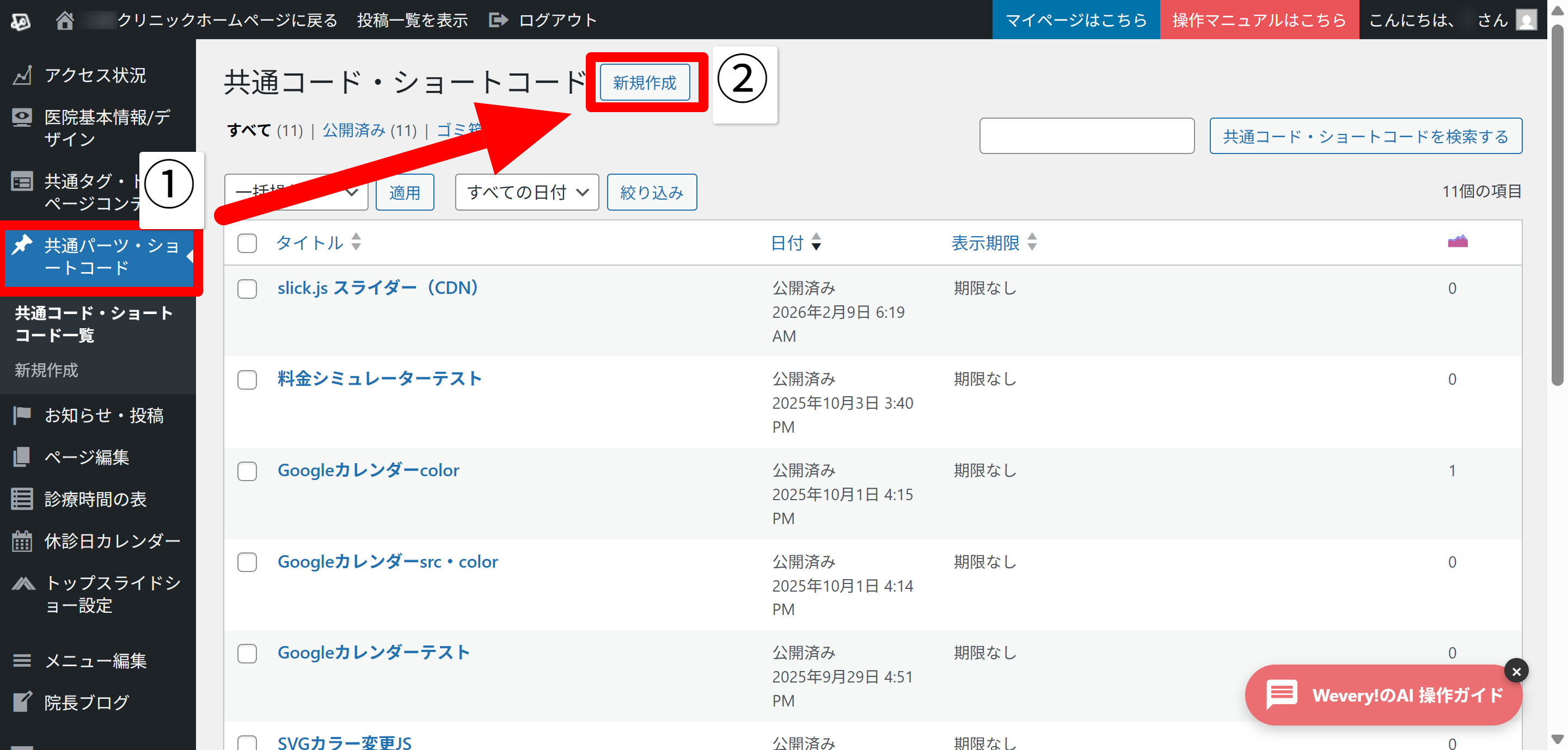 - 「共通コード・ショートコード」をクリック