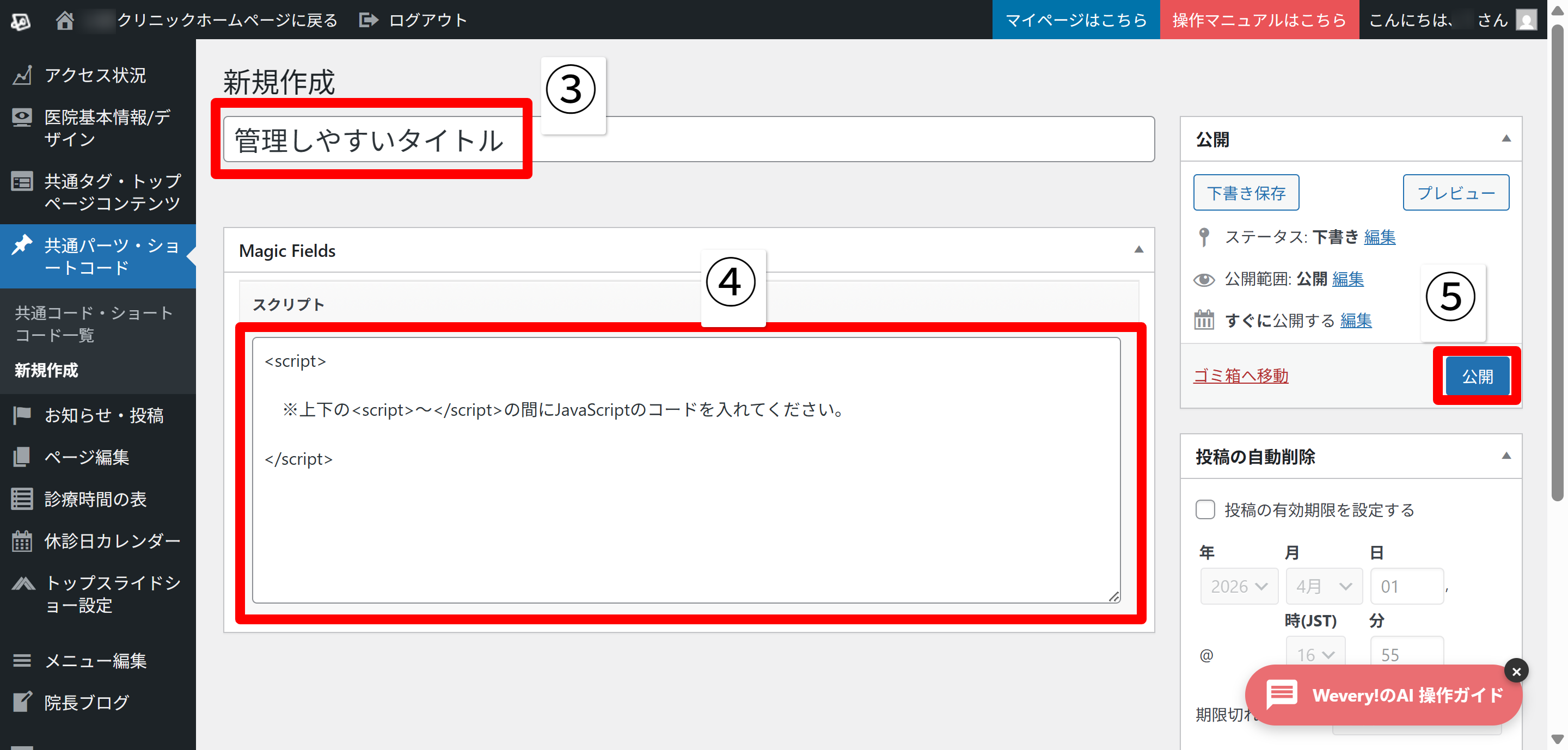 ※この際、JavaScriptのコードは <script></script> で囲んでください - 「公開」ボタンをクリック