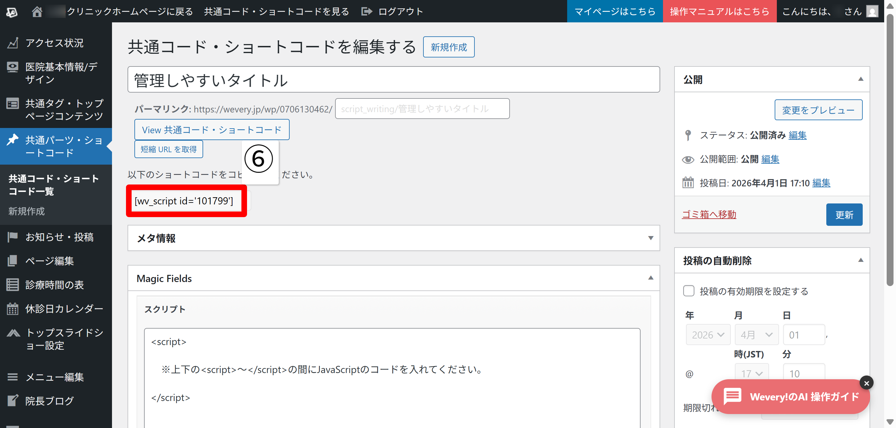 - タイトルと「スクリプト」欄の間に [wv_script id=’〇〇〇〇〇〇’] というショートコードが表示されますので、そちらをコピー