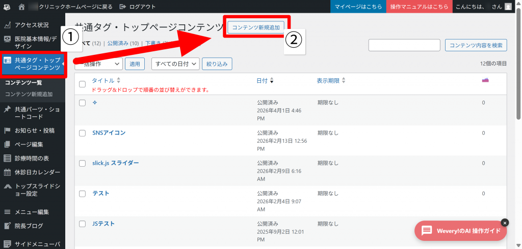 共通タグ・トップページコンテンツで新規コンテンツを追加。