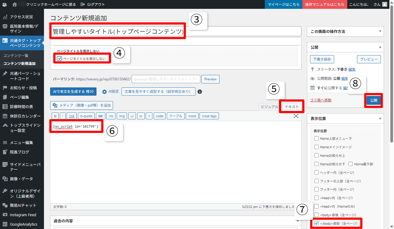 コピーしたショートコードをトップページに設置する