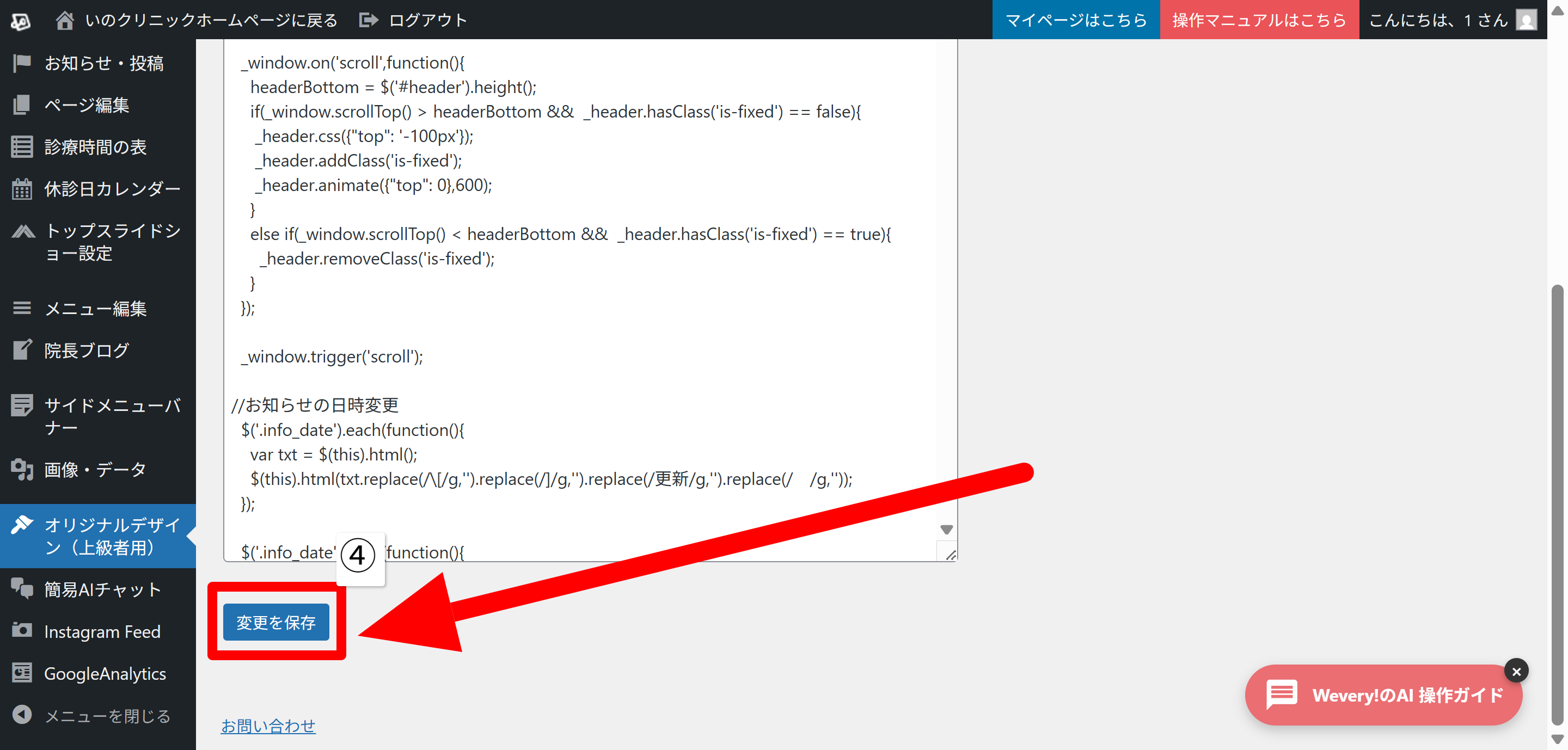 保存後、ホームページに崩れが発生した場合は、控えておいた既存のコードを貼り付けて再度保存してください。 - ページ下部にある「変更を保存」ボタンをクリックし、編集内容を保存します。